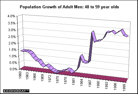 The motorcycle phenomenon seems to be related to an aging population. (The Wild One for our parents, Easy Rider for us!) Stories abound about aging Baby Boomers, now finished putting their kids through school, purchasing their first motorcycle. The chart below shows the population growth of men in the 40-to-59 bracket. We should also look at the female population growth trend, since many women are no longer satisfied hanging on in the back seat. The chart shows that annual growth for this segment is pretty healthy even if it peaked a few years ago. Thus, demographic factors are playing a major role in demand for recreational vehicles such as motorcycles.