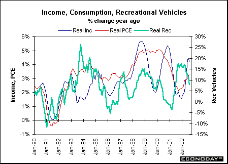 Motorcycles are basically adult toys. What induces these types of discretionary purchases? Certainly, income growth plays a major role in their demand. The chart below shows the yearly pace of real (inflation-adjusted) income and consumption growth compared to annual gains in growth for recreational vehicles. (These are not limited to motorcycles, but include the entire recreational vehicle market.) Notice that income and consumption typically move in the same direction, although there were periods in the 1990s when consumer spending outpaced income. Typically, this occurred during strong expansionary periods when the stock market was also accelerating rapidly. The yearly growth in spending on recreational vehicles did not always jive with total consumption expenditures. During some periods, spending on recreational vehicles moderated more sharply than spending overall; at other times, these purchases accelerated more rapidly than total consumption - such as in much of the past year. What other factors are important in purchasing large ticket items?