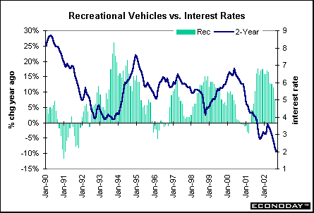 The chart below compares spending on recreational vehicles to interest rates. We use the yield on the 2-year Treasury note as a proxy for interest rate levels. Notice that high interest rate periods are not good for spending on recreational vehicles while declining rates tend to spur this type of expenditure. Demand for recreational vehicles has been particularly strong over the past 18 months when interest rates have come down significantly.