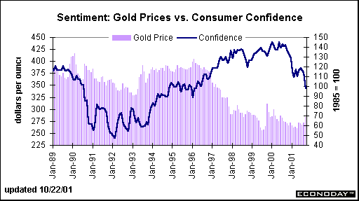 prices to the Conference Board's consumer confidence index. Note the jump in gold prices in early 1990 at the time of the Persian