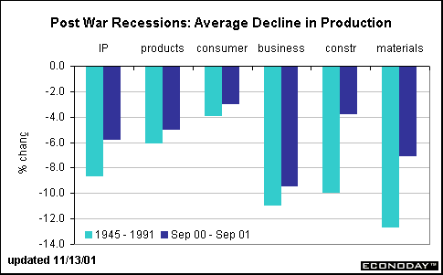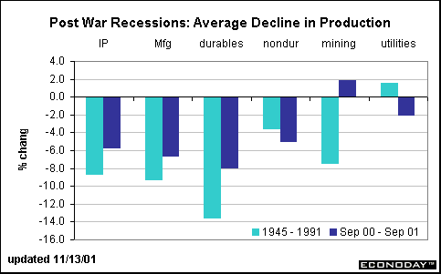 The index of industrial production -- covering manufacturing, mining and utilities -- has declined a comparatively mild 5.8 percent since its peak reached last September. The 12-month drop is not as bad as the average postwar recession, but then this recession isn't over yet (nor are we certain when it began). The chart below compares the average decline from peak to trough in the nine postwar recessions relative to the decline posted in production over the past twelve months. Only the 1990-91 recession showed a smaller decline, when production fell 4.3 percent. The largest production decline was posted during the 1973-75 recession (-14.9 percent).