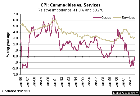 We all know that food and energy prices are more volatile than the rest of the CPI components. But these aren't the only components that are causing the CPI to fluctuate. The CPI has always incorporated both commodities (goods such as apparel, autos, gasoline and food) and services (services such as housing rent and public transportation services) within its index, although their relative importance has altered over time. For instance, 20 years ago the split between goods and services was roughly 50/50. The relative importance has shifted so that commodities account for a good deal less than half of the index today - exactly 41.3 percent. The remaining 58.7 percent is attributed to services. The distribution of goods and services plays a major role in determining whether inflation can quickly turn to deflation.