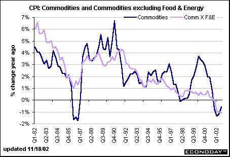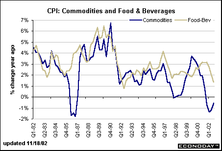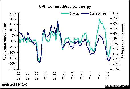 Energy commodities account for 2.8 percent of the total CPI and less than 7 percent of the commodities portion. Yet they largely determine the direction of movement in the commodities CPI. Note the scale on the left axis ranges from -25 to +25 percent and corresponds to energy price changes over the past 20 years. Total commodity prices have ranged in a much narrower band; outright declines in the commodity CPI occurred only less than a handful of times in the past 20 years: Q2-Q486; Q198; and most recently Q401 to Q302. Each time, energy prices were an impetus behind the drop.