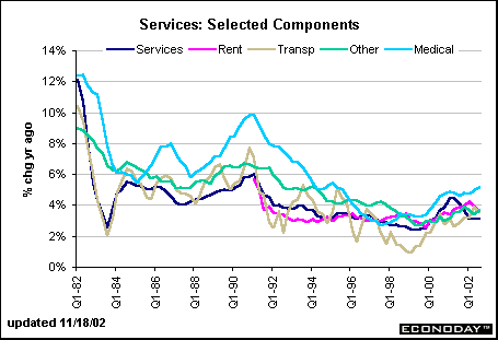 In the service sector, prices don't tend to decline. At least we haven't seen a drop in services prices in the consumer price index. The major components of the services index include: rent of shelter, transportation services, medical care services and other services. The single largest component is rent of shelter accounting for 31.2 percent of the total CPI and 53 percent of the services index. This index only goes back to 1991, but notice it has remained in a tight band these past ten years. The biggest moderation in inflation rates came from transportation services, but these appear to have hit their lows in 1999 and have since accelerated. Medical care services are the fastest growing component, similar to its commodities cousin.