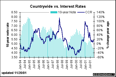 Notice in the chart below, which depicts the year-over-year change in the stock price of Countrywide Credit relative to interest rate levels, that