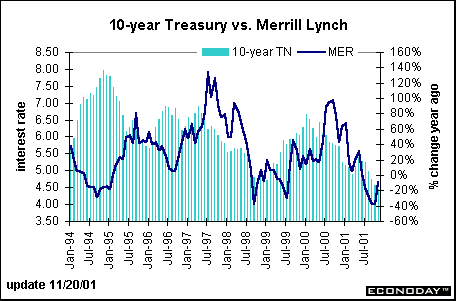 The chart below compares one of our brokerage firms, Merrill Lynch, to the levels of the 10-year Treasury note. In a similar fashion, the price of