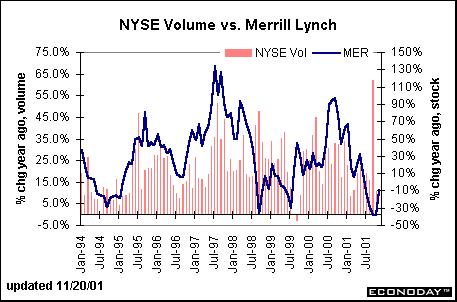 in the S&P 500. In contrast, Merrill Lynch's stock price moves more closely in line with volume on the New York Stock Exchange.