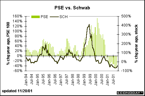 dramatically, as was the case for Schwab's stock price. As it turns out, however, neither volume in the Nasdaq market nor year-over-year