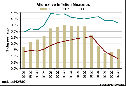 The GDP deflator showed dramatic improvement in the past five quarters, but the employment cost index tends to change more slowly over time. The CPI accelerated in the third quarter, but remains tame by historical standards.