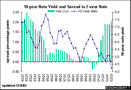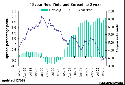 Yields on the 10-year Treasury note and the 2-year Treasury note both inched up slightly in November. Nevertheless, the spread widened slightly from a month ago. Bond investors are now starting to look ahead towards economic recovery - and a burgeoning federal budget deficit which will lead to increased supply of Treasury securities in the coming year.
