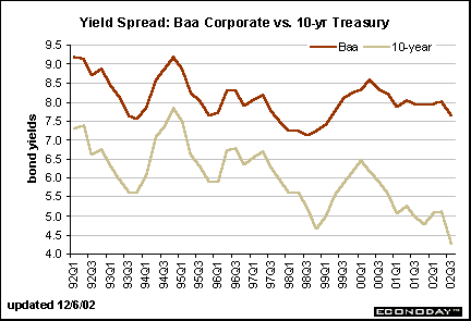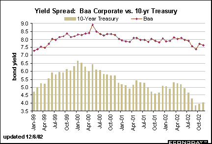 Yields on Baa corporate bonds are down from their peak reached in May 2000, but are hardly unchanged despite rapid declines in the Treasury market in 2001. As yields on Treasury securities have inched lower in the past six months, yields on Baa bonds have declined more slowly. The Baa average yield inched down in November, but remains above levels of the past several months. Default risk is a larger concern for Baa rated corporate bonds than Aaa rated bonds.