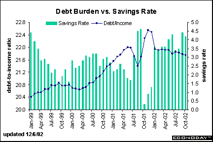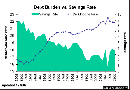 Debt burdens are at historically high levels. The personal savings rate plunged in late 2001 in response to increase auto purchases; otherwise, the general trend in savings is positive. In periods of economic uncertainty, or during recessions, consumers tend to add to savings and diminish debt burdens.