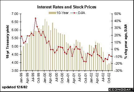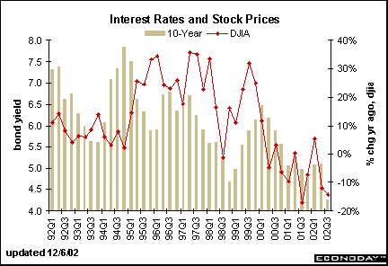 The combination of lower interest rates and declines in yearly returns in the DJIA signaled the slowdown in economic activity we saw in 2001. The yield on the 10-year note inched higher in November; stock prices rose in both October and November; although, the Dow Jones Industrials are still well below year ago levels.
