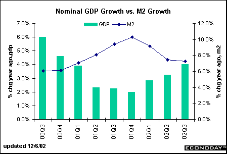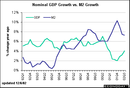 M2 has declined in the past three quarters, perhaps signaling moderation in the rate of nominal GDP growth. Rising M2 levels reflect the flip side of the declining federal funds rate target, although a declining growth rate doesn't necessarily mean that the Fed has changed its interest rate target. A pure monetarist would point to the drop in M2 growth and confidently predict a slowdown in economic growth. Rapid monetary growth can lead to inflationary pressures in a fully employed economy operating at high capacity rates, but we aren't anywhere near that point now.
