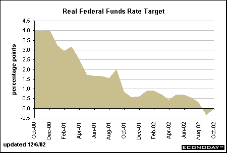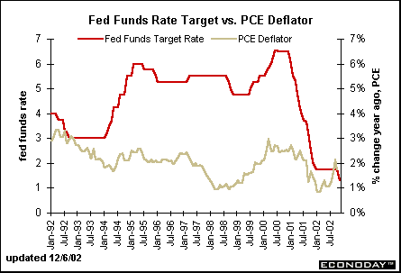This chart shows the gap between the funds rate and the yearly change in the PCE deflator in a different way. In essence, the gap reflects the "real" (inflation-adjusted) federal funds rate. The federal funds rate target and the year-over-year change in the PCE deflator turned negative in September as the PCE deflator rose 2.2 percent from a year earlier while the fed funds rate target was under 2 percent. In October the real fed funds rate target was zero. At these levels, monetary policy is highly stimulative as claimed by several Fed officials in the past few months.