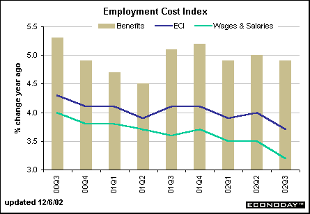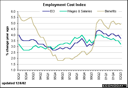 The employment cost index rose 3.7 percent in the third quarter of 2002 versus year ago levels; a bit slower than the previous quarter. Wages and salaries rose 3.2 percent in the third quarter as wage gains continued to moderate. The major problem stems from higher benefits costs which jumped 4.9 percent in the July to September period. On the whole, the employment cost index is not a worry for Fed officials these days, as it doesn't indicate runaway inflation. In fact, it allows Fed officials more leeway in keeping interest rates at low levels.