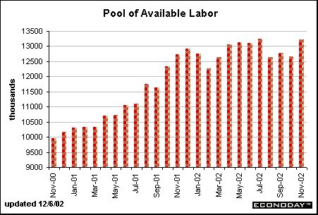 The pool of available labor increased in November after moderating in the three previous months. As economic conditions improve, the pool of labor may decrease (and the total labor force may increase more dramatically).