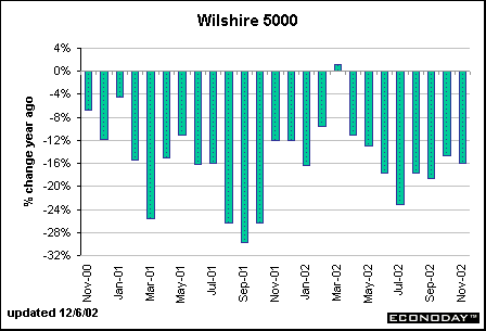 The Wilshire 5000 jumped 5.9 percent in November after a 7.5 percent in October, but was still down on a year-over-year basis in both months. As long as stock prices are weak, it suggests that consumer spending could be dampened by the wealth effect, rather than enhanced by it. This will prevent the Fed from raising the federal funds rate target very quickly.