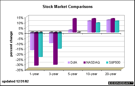 The chart below compares 1-year, 3-year, 5-year, 10-year and 20-year average annual changes in the key equity market indexes. Clearly, the NASDAQ composite fell more sharply in 2002 than either the Dow or the S&P 500. Even the 3-year average shows quite a plunge for the NASDAQ. Over the three years, the NASDAQ has retraced more than its entire 1999 gain of 85.6 percent. The 3-year returns for the Dow and S&P are also negative, although the declines are less dramatic then the loss for the technology-laden NASDAQ index.