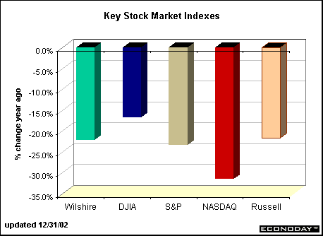 Economic conditions themselves may not warrant such a sharp decline for the stock market. The market feels undervalued going into 2003, much as it seemed overvalued going into 2000. But investors have good cause for weariness. Aside from the corporate scandals that shook investor confidence in 2002, we approach 2003 with great uncertainty. War with Iraq appears a strong possibility and tensions with North Korea have become more strained. One can't pick up a newspaper without reading of terrorist plots.