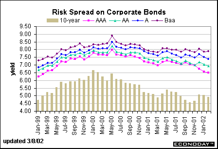 The chart above also compares corporate bonds with the 10-year note. One often hears the term "benchmark" applied to the 10-year note. Corporate bonds are matched against the Treasury security that holds benchmark status in order derive a relevant interest rate. Not only does it make it easier to assess risk by pricing corporate bonds this way, it gives investors some idea as to what they are getting themselves into. As the probability of default and credit ratings increase, yields grow higher and begin to separate themselves from the benchmark 10-year note.