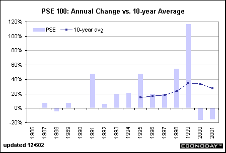The PSE Technology 100 Index is a price-weighted measure of 100 listed and over-the-counter stocks from 15 different industries. These include computer hardware and software development, semiconductors, networking, communications and data storage and processing. The 10-year average growth in this index surpasses all other major indexes at 27.2 percent in 2001.
