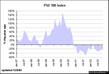 Considering that the PSE (Pacific Stock Exchange) Index was up 152.7 percent at its highest point in early 2000, it is amazing that the index fell only 50 percent in September 2001 from year earlier levels! Many of the companies included in this index are household names - AOL, Yahoo, Microsoft, Texas Instruments, Lucent, Intel, and Amgen. Declines continued through November, but at a slower pace than in 2001.