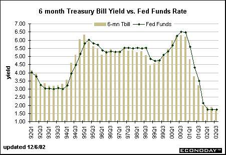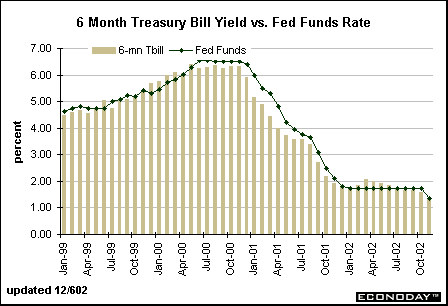 In 2000-01, the yield on the 6-month Treasury bill was 26 basis points below the federal funds rate, on average. Note that the 6-month yield was above the funds rate from 1999 through May 2000, but fell below the funds rate. This implies that market players were expecting the Fed to tighten in the first half of the year, but ease in the second half of 2000 and in 2001. In February 2002, the yield on the 6-month bill began to rise as market players anticipated that the Fed would soon raise rates. Investors now believe that the Fed won't raise rates for several months. This is putting a damper on 6-month bill yields.