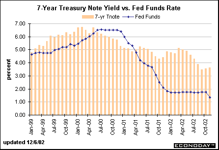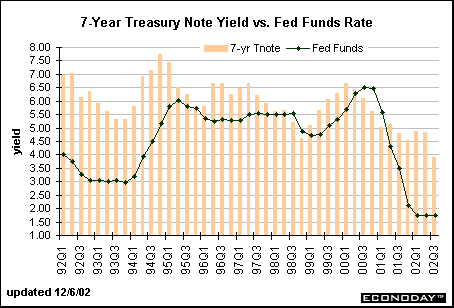 The spread between the 7-year note yield and the federal funds rate averaged +47 basis points in 2000-01. The spread was negative in 2000 and early 2001 before the Fed began to aggressively reduce the federal funds rate target. Yields were up only a tad in November as investors still view the Treasury market as a safe-haven. Bond investors are not expecting any Fed policy changes in the near term.