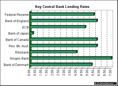 With little in the way of economic news investors were on their own last week, focusing on earnings prospects and central bank activities. In Australia, the Reserve Bank of Australia cut interest rates by 50 basis points to 5.75 percent as recent data suggest the economy is slowing after 14 quarters of plus-4-percent growth. In Britain, the Bank of England edged the policy making interest rate down by 25 basis points to 5.75 percent. Preliminary fourth quarter growth slowed to 0.3 percent. Inflation is tame, remaining below the 2.5 percent target rate for the past 21 months. The Bank of England's interest rate is above both the United States (5.5 percent) and the ECB (4.75 percent).