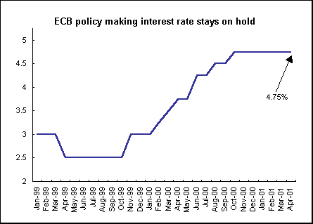 ECB President Wim Duisenberg issued an unusual statement on Friday confirming the central bank's wait and see attitude. The statement, which emphasized that inflationary dangers still persist, suggests that the ECB wants to dampen speculation of a near-term rate cut. Right now, the bank is inclined to weigh any rate cut very carefully because it is obliged by treaty to fight inflation first and foremost - with cyclical growth considerations taking a backseat. The bank's benchmark of "tolerable" inflation is 2 percent. Though inflation rates vary widely throughout the region, the inflation rate stood for the EMU as a whole stood at an average of 2.6 percent in February.