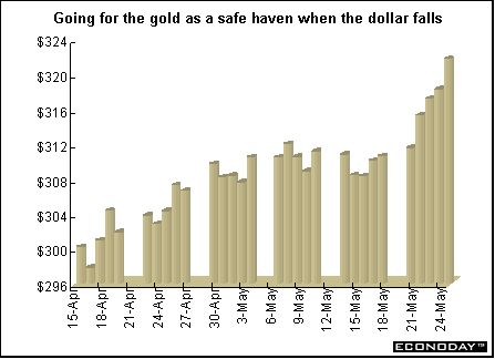 CurrenciesThe foreign exchange market continued its assault on the U.S. dollar, especially versus the yen. However, intervention by the Bank of Japan on Wednesday and Thursday has stabilized the dollar for now. If past is prologue, note that the yen also jumped when Japan's economy began to rebound in 1995 and 1999. But a stronger yen is a negative for an economy that still lacks momentum on the domestic side. When currencies rise on expectations of economic recovery, the rise hurts exporters and threatens to nip any recovery in the bud. The increased value of the currency makes exports to the United States less competitive and threatens the very economic expansion that is driving the currencies up.  In Japan, exports make up only about 10 percent of gross domestic product. But exports are the most dynamic sector of the economy. Japanese car companies, for example, have been making gains overseas at the same time that domestic consumption continues to languish. And with domestic consumption so flat, any increase in exports has a very big impact. Exporters are now predictably concerned that the yen’s rise will squeeze overseas revenues. While the spotlight at the moment is on the yen, the euro has also been benefiting from dollar bashing. On Thursday, for example, Germany released truly abysmal GDP data. But currency traders ignored the bad news and bid up the euro anyhow. Right now, anything dollar related is bad news — even if it is good news — while any news from the EMU is blithely ignored by market players. Europe is lagging the United States in economic recovery by at least one quarter. In addition, it continues to struggle with structural reforms especially in the labor and financial markets. Unlike the U.S., inflation has become a gnat in the ear of the ECB, which by charter must steer monetary policy by price expectations.  The price of gold has climbed to its highest levels in two and a half years, thanks to its allure as a reliable investment in times of crisis and the declining appeal of other safe haven assets. Rising prices are being driven by Middle East tensions, the increasingly menacing situation in Kashmir and recent terrorist threats against the United States. To some, the U.S. dollar, a traditional safe haven, is looking increasingly vulnerable. But perhaps the biggest spur for gold prices in recent months has come from the Japanese market. Many investors there are hoarding gold amid rising concerns about the safety of the banking system. The flight into gold increased after April 1, when the government placed a cap of ¥10 million ($81,000) on deposit insurance for some types of accounts.  |