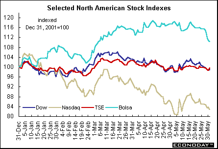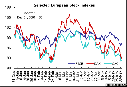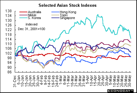Recap of global marketsEurope and BritainThe London FTSE, Paris CAC and Frankfurt DAX have had two dreadful months. All three indexes were up on the year at the end of the first quarter. Now none are. The FTSE has declined the least, losing 4.4 percent in April and May while the DAX has dropped 11.8 percent and the CAC 9.1 percent. The reasons for the declines are many yet they don’t differ much from those behind the weakness in Canada and the United States. Political uncertainties continue to worry investors, who are seeking safe-haven investments and are spreading their risk by diversifying geographically and by type of asset.  Last week was typical of second quarter malaise. Investors have decided that the U.S. recovery will slow from its torrid first quarter pace. As a result they are selling U.S. equities (and the dollar also). This is despite extremely weak GDP data from the European Monetary Union and Britain, where growth was virtually non-existent in the first quarter. In the EMU, growth came solely from exports, not domestic demand. The FTSE lost 1.6 percent on the week and the DAX and CAC lost 1.7 and 1.4 percent respectively. AsiaAsian equities indexes followed here have outperformed both Europe and North America. Three of the six Asian indexes — the Nikkei, Topix and the Hang Seng — have improved so far in the second quarter. The Nikkei and Topix have been rising because of government limitations on short selling combined with a leveling out in economic weakness thanks to increased exports to the United States. With investors looking for safe havens, foreign investment flows to Japan have increased. The Nikkei 225 stock average has climbed 11.6 percent this year, boosted by six straight weeks in which foreigners increased their Japanese stock holdings (data from the Tokyo Stock Exchange). Many foreign investors, who must first purchase yen to buy shares, are betting that Japan is rebounding from recession.  Indexes have been rising and falling on U.S. performance. This is especially true of exporting countries that rely on U.S. markets. Investors have been attracted to overseas markets in increasing numbers because they see that the U.S. might not grow as fast as investors wish. They are especially worried about the type of growth — inventory and consumer rather than a rebound in capital spending. Despite doubts over U.S. growth, the Topix index lost 1.7 percent last week and the Nikkei 225 stock average 1.8 percent. The indexes pared gains after Moody's Investors Service cut Japan's credit rating two notches to A2 and said the government's economic policies won't be enough to stem the nation's rising debt. Moody's had warned since February that it was considering such a move. AmericasWith the exception of the Mexican Bolsa, the Dow (down 1.0 percent since 2001) and Toronto S&P/TSX (down 0.4 percent) have fallen into negative territory in the last two months. The Bolsa cut its margin of growth since the end of 2001 from 15.5 percent at the end of March to 10.4 at the end of May. The Nasdaq’s losses deepened to 17.2 percent from 5.4 percent at the end of the first quarter. Aside from the continuing undercurrent of political uncertainty, investors have been afflicted by accounting and profit concerns. They have adapted the “I’m from Missouri” attitude of distrust, either not believing in or being skeptical about all company data thanks to Enron and assorted other accounting sagas. Despite positive economic data, investors have adopted a wait-and-see attitude. It is uncertain what will convince them that economic growth has revived after a short, shallow recession. Profits generally lag an upturn, given the write offs that traditionally are taken as firms cleanse balance sheets and expense accounts of excesses incurred during the previous growth period.  Last week was no help. Even after good economic data from both Canada and the United States, investors refused to believe. They wonder if great productivity data are ever going to translate into profits. |