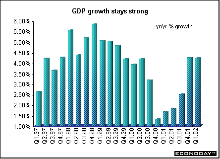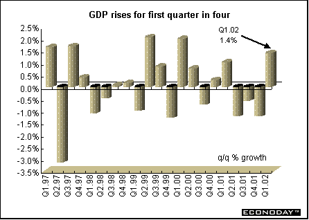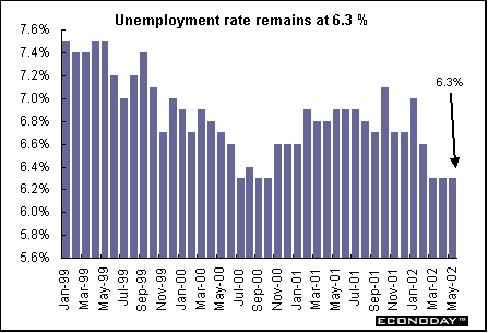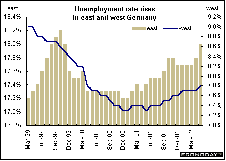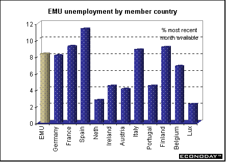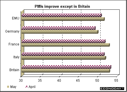 Indicator scoreboardEMU — April seasonally adjusted unemployment rate rose to 8.3 percent from a revised 8.2 percent rate in March. The entire unemployment series was revised downward, largely due to new methodology in Spain. Spain continued to show the highest unemployment rate at 11.3 percent. This was followed by France (9.2 percent), Finland (9.1 percent), Germany (8.1 percent) and Belgium (6.8 percent). Luxembourg showed the lowest unemployment rate (2.2 percent) followed by Austria (4.0 percent). It is estimated that 11.5 million men and women were unemployed in April.  April industrial producer prices rose 0.3 percent primarily due to increased energy prices. On the year, the PPI sank 0.7 percent. As in March, energy prices were the major contributor to higher producer prices, rising by 1.6 percent. However when compared with last year, energy prices declined 3.9 percent. Excluding energy prices, the PPI rose 0.2 percent and 0.2 percent on the year. Prices in all major categories except capital goods rose.  May seasonally adjusted Reuters manufacturing purchasing managers index rose to 51.5. This was the seventh consecutive rise. An index level above 50 signals expansion, below 50, contraction. The higher the index is above 50, the faster the expansion. Country results remained mixed, with Germany still contracting. Input prices rose to 56.0 from 53.9 in the previous month — the fastest pace in 15 months.  May seasonally adjusted Reuters services activity index fell to 52.1 from 53.3 in the prior month. Shrinking German services activity slowed the pace of overall sector growth. Growth slowed in France and Ireland. Despite the softer growth, this was still the fifth month of service sector expansion. Slower growth lessened pressure on prices charged for services, as the index dropped from 53.3 to 50.9, the slowest rate of increase since December. Labor and materials costs continued to outpace prices charged. The composite index for services and industry dipped to 52.6 from 53.2 in April. Germany — April seasonally adjusted manufacturing orders jumped 2.3 percent and 1.3 percent when compared with last year. Domestic orders jumped 4.5 percent but foreign orders fell 0.8 percent. Foreign demand fell 4.1 percent in the important investment goods category. The rise in domestic demand may partly reflect a stocking up in anticipation of an IG Metall strike, which lasted for 10 days beginning May 6. The April rise results exclusively from a 3.2 percent orders rise in west Germany, while orders in east Germany fell 9.6 percent on the month.  May seasonally adjusted unemployment jumped by 60,000 in May. The pan German unemployment rate rose to 9.7 percent from 9.6 percent in April. The unemployment rate rose to 7.8 percent from 7.7 percent in west Germany while climbing to 18 percent from 17.8 percent in the east. A number of special factors added to the sharp rise in joblessness, including the effects of ongoing wage conflicts that caused employers to reduce hiring or increase lay-offs, especially in the construction sector. Moreover, under a new jobs law there was a marked shift to unemployed status from non-worker status.  Britain — May Halifax house price index rose 4.2 percent and soared 18.5 percent above the level of a year earlier. A combination of very low interest rates and unemployment has boosted housing demand, which together with a shortage of suitable properties for sale, have driven prices up sharply.  The May Chartered Institute of Purchasing and Supply purchasing managers' index slipped to 52.9 from April’s 53.2 level. The measure of manufacturing output was the strongest in two-and-a-half years with steady growth in export orders. But there was a slowdown in the growth of domestic orders, and the index of employment fell. May Chartered Institute of Purchasing and Supply service sector activity index jumped to 56.7, from 54.5 in April. This was the highest level since February 2001. The latest increase in service sector activity reflected increased levels of new business. Asia Japan — First quarter seasonally adjusted capital spending by companies (excluding banks, insurers and other financial firms) fell 5.2 percent and 16.8 percent when compared with last year. Spending by all types of companies, including financial institutions, probably fell 1.1 percent after a record 12 percent drop in the fourth quarter. Business spending accounts for about 15 percent of gross domestic product. First quarter real gross domestic product jumped 1.4 percent but continued to fall when compared with the previous year. On the year, GDP sank 1.7 percent. On an annualized basis — the basis that is comparable to the U.S. results — GDP jumped 5.7 percent, outdoing the 5.6 percent rise in U.S. GDP. This was the first quarter in four that GDP rose. Recovering overseas economies have created more demand for Japanese exports and have helped fuel a pickup in industrial output. Exports jumped 6.4 percent in the Jan-to-March quarter from the previous quarter, rising for the first time since the Jul-to-Sept 2000 quarter. Capital spending sank 3.2 percent. The decline followed a 12.0 percent plunge in investment in the Oct-to-Dec quarter. Public investment increased 4.1 percent from the last three months of 2001 as regional governments used up the remainder of their budgets for the fiscal year that ended in March. The government's second supplementary budget from last fiscal year also kicked in during March, giving public spending an additional boost. Government investment sank 6.4 percent from a year earlier. The GDP deflator, a measure of inflationary pressures, fell 0.9 percent from a year earlier, the 16th straight decline.  Australia — First quarter gross domestic product rose 0.9 percent and 4.2 percent when compared with last year. The price deflator for private final household consumption rose 0.9 percent and 2.5 percent on the year. Pacing Australia's first-quarter growth, h