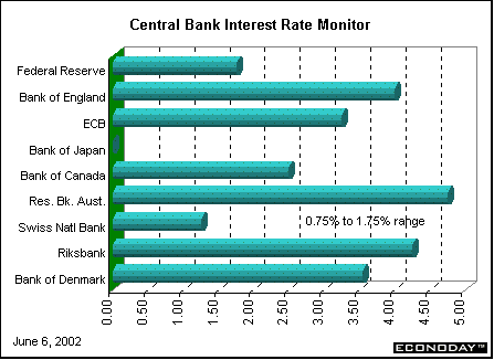 | Last Week’s HighlightsInvestor confidence took yet another body blow as ugly corporate news trumped ugly political news. Enronitis yielded to Tycosis and is exacerbating investors’ worries about corporate governance and reporting anew. There continues to be a dichotomy between mostly bad market sentiment and mostly good economic data. Investors view earnings reports with skepticism and continue to punish good companies when earnings projections falter. All 13 equities indexes tracked here were down on the week. Central banks — two raise rates, two don’t… Two of the four major central banks that met last week raised their key interest rates by 25 basis points. The Bank of Canada raised its overnight interest rate to 2.5 percent. The bank said the economy had recovered more strongly than anticipated since its last interest-rate announcement on April 16. The bank has an inflation target between 1 and 3 percent but tries to stay as close to the 2 percent midpoint as possible. April core inflation rose to 2.2 percent, adding to the Bank’s concerns. As expected, the Reserve Bank of Australia raised its benchmark interest rate 25 basis points to 4.75 percent. In April the bank, also in a 25-point increment, lifted rates from a 28-year low of 4.25 percent. The Bank is worried that the housing boom combined with strong consumer spending may fuel inflation. The move came just prior to first quarter GDP data, which showed a second straight quarter of 4.2 percent year-to-year growth. The inflation rate, which is now 2.9 percent, remains uncomfortably close to the bank's 3.0 percent ceiling.  Both the European Central Bank and the Bank of England decided to keep borrowing costs unchanged. EMU countries barely grew in the first quarter — up a measly 0.1 percent when compared with last year and up 0.2 percent when compared with the fourth quarter. British growth was up 1 percent when compared with last year (and no change when compared with the fourth quarter). The ECB, which sets interest rates for countries from Finland to Portugal, left its main lending rate at 3.25 percent. In his press conference that followed their meeting, ECB President Wim Duisenberg suggested the ECB might raise rates soon to contain inflation. But the ECB wants to avoid dampening the fledgling economic recovery by raising rates too soon. While business and consumer confidence both grew in May, unemployment rose in April as manufacturers shed jobs. The Bank of England’s key interest rate remains at 4 percent — its lowest level since 1964. As in the United States, low rates are encouraging consumers, who fuel two-thirds of the British economy, to borrow and spend more, especially on housing. In May, housing prices soared at a record pace, rising faster than the previous record set in July 1988. |