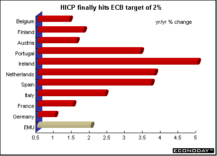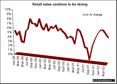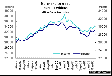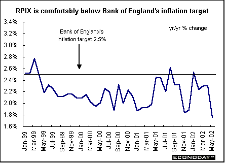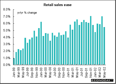 May harmonized index of consumer prices rose 0.1 percent and 2.0 percent on the year. The ECB’s inflation target is 2 percent. Core HICP, which excludes energy, food, alcohol and tobacco, rose 0.3 percent and 2.6 percent on the year. Price increases were recorded for hotel/restaurant services, recreation, household equipment and clothing. Price decreases were recorded for energy and communications.  April seasonally adjusted merchandise trade surplus with the rest of the world was €6.1 billion, down from €9.6 billion in March. Exports slipped 1 percent while imports rose 3 percent. On an unadjusted basis, EMU exports rose 5 percent on the year, while imports rose 1 percent. Germany — May wholesale prices fell 0.4 percent and were down 1.3 percent when compared with last year. Seasonal food prices (fresh fruit and vegetables) fell 7.4 percent and 4.4 percent on the year. Excluding seasonal food prices, wholesale prices fell 0.1 percent and 1.1 percent on the year. Excluding oil products, wholesale prices fell 0.5 percent and 0.8 percent on the year. France — April seasonally adjusted current account surplus widened to €1.226 billion. Merchandise exports jumped 5.0 percent while imports rose only 1.3 percent. The services surplus widened slightly amid declining flows. Imports dropped 7.3 percent, while exports fell 2.8 percent. May seasonally and calendar adjusted consumer spending on manufactured goods dropped 1.3 percent, with a downturn in all sectors except household durables. However, when compared with last year, spending was up 2.0 percent. Spending on manufactured goods accounts for 27 percent of total consumer spending, and erratic monthly results are often revised. Total durables spending was 1.1 percent higher, thanks to a rebound in household durables. Excluding the auto sector and medical products, spending was down 1.3 percent on the month but 1.9 percent higher on the year. Italy — April industrial orders jumped 8.3 percent when compared with last year, the strongest gain since January 2001. Domestic orders rose 4.7 percent while foreign orders surged 13.9 percent. Domestic orders account for around 62 percent of the overall index, with foreign orders making up some 37 percent. Eight of ten product sectors rose. April seasonally adjusted orders (which are not closely followed by most analysts) gained 0.4 percent from March. April domestic orders shed 1.8 percent on the month, while orders from abroad rose 3.6 percent. Britain — May retail price index (RPI) climbed 0.3 percent and 1.1 percent when compared with last year. The retail price index excluding mortgage interest payments (RPIX) increased 0.3 percent and 1.8 percent on the year. The Bank of England, with an inflation target of 2.5 percent, uses the RPIX as its gauge. Lower food and energy costs contributed to the benign rate.  May seasonally adjusted retail sales volumes fell 0.6 percent but were 5.4 percent above levels a year earlier. This was the largest monthly decline since February 2000. National Statistics advised caution when interpreting monthly changes in sales due to problems with the seasonal adjustment. The late May bank holiday was put back a week this year and fell in June and an extra public holiday for the Queen's Golden Jubilee was also added in June. The drop was due largely to falling clothing and footwear sales. In the three months to May, retail sales volumes rose 1.9 percent compared with the previous three months, up from 1.8 percent in the three months to April.  Asia Japan — May seasonally adjusted merchandise trade surplus widened to ¥908 billion ($7.3 billion) from a revised ¥775.4 billion as exports gained for a fifth straight month. Exports climbed 5.7 percent, the biggest gain since January. Imports rose 3.2 percent. The increase in exports was led by autos, with car shipments to the U.S. and Europe rising by a third from a year ago. Sales of memory chips and electronic parts to Asia rose by a fifth from a year ago, and steel shipments rose 38 percent. By volume, exports gained 15 percent from a year ago, led by a 22 percent increase to Asia. April seasonally adjusted tertiary industry index fell 1.5 percent after a 1.3 percent rise in March. When compared with a year ago, the index fell 1.2 percent. The tertiary index tracks activity at insurers, banks, power utilities and other service providers. Demand at financial institutions and insurance providers fell 1.1 percent in April, and wholesalers, retailers, and restaurants declined 0.6 percent. The all-industry activity index (which adds factory production, government spending and other components to the tertiary index to create a proxy for gross domestic product) fell 1.3 percent from a month earlier. It declined 2.5 percent from a year earlier, the 11th straight decline. Americas Canada — April manufacturers’ shipments jumped 5.0 percent. Even though eighteen of the 21 major groups representing 93.3 percent of total shipments rose, the major impetus came from the motor vehicle sector. Excluding that industry, April's shipments rose 3.3 percent. Unfilled orders rose 0.6 percent, a third consecutive monthly increase. Excluding the effect of the aerospace product and parts industry, unfilled orders grew by 2.1 percent. New orders grew 4.5 percent, the highest level since May 2001. April merchandise trade surplus jumped 11.0 percent to C$5.2 billion, the highest level since May 2001. Merchandise exports rose 2.9 percent to C$34.3 billion, the highest level since June 2001. Export growth was particularly strong in automotive products, which rose 4.1 percent. Machinery and equipment increased 2.6 percent. Merchandise imports rose 1.6 percent to C$29.1 billion. The trade surplus with the United States jumped 8.2 percent. Canadian exports to the United States jumped 2.4 percent while imports eked up 0.3 percent. Canada's total trade deficit with nations other than the United States rose C$109 million to C$3.1 billion 