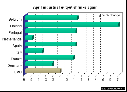 Indicator scoreboardEMU — April seasonally adjusted industrial output sank 0.5 percent and 1.2 percent when compared with last year. Intermediate goods sector fell 0.5 percent and the energy sector dropped 0.7 percent. Durable consumer goods industrial output rose by 1.3 percent, for capital goods by 0.7 percent and for non-durable consumer goods by 0.4 percent. But these categories were down when compared with last year by 6.7 percent, 3.2 percent and 0.6 percent respectively.