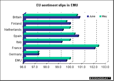 EU — June European Commission's economic sentiment index fell modestly to 99.6 from 99.9 in the previous month. Among the larger eurozone countries, economic sentiment fell in Italy and in France. It was unchanged in Germany. Industrial, consumer, construction and retail sector sentiment all slipped. Industrial confidence slipped to minus 10 from minus 9 in May. Consumer sentiment fell to minus 9 from minus 8 in May.