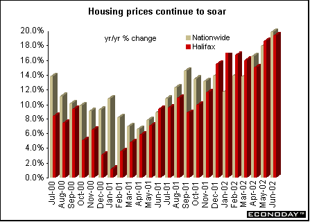 France — First quarter seasonally and workday adjusted final estimate of gross domestic product rose 0.4 percent and 0.4 percent when compared with last year. Investment growth was revised upward to 0.8 percent from the original estimate of 0.2 percent. However, export growth was revised down more than import growth.  Italy — May producer prices rose 0.1 percent but fell 0.9 percent when compared with last year. Excluding energy, the PPI was up 0.2 percent and 0.5 percent on the year. Britain — June seasonally adjusted Nationwide house price index rose 3.3 percent and 19.8 percent on the year. This was its highest level since the late 1980s. The average house price rose to £106,693.  June Halifax house price index jumped 2.3 percent and soared 19.3 percent on the year. The Halifax said the housing market was being supported by low interest rates, rapid income growth and shortages of suitable properties. Prices have risen by 11 percent since the start of the year, with the average house now costing £109,667. June Chartered Institute of Purchasing and Supply purchasing manufacturing index slowed to 50.5 from 52.7 in May. There was a sharp decline in the output index, which dropped to 53.6 from May's 56.0. New orders also dropped to 51.3 from 55.8, and export orders fell to 51.0 from 55.2. Asia Japan — The Bank of Japan's quarterly Tankan survey of business sentiment for big manufacturers jumped to minus 18 from minus 38, offering further confirmation that the economy has pulled out of its worst postwar downturn. The improvement was the first rise since the fourth quarter of 2000. The diffusion index measures the percentage of companies saying economic conditions are good minus the percentage saying conditions are bad. The sentiment index for large non-manufacturers improved to minus 16. The index for small non-manufacturers improved to minus 37 from minus 42. The small manufacturers’ confidence index rose 10 points to minus 41. A negative reading means more companies are pessimistic than are optimistic about the outlook. The central bank surveyed 8,550 companies between May 30 and June 28.  Americas Canada — June unemployment rate dropped to 7.5 percent from 7.7 percent in May. Employment rose by 66,400. The June gains continued the upward trend in employment begun at the start of the year, with employment up 303,000 or 2.0 percent since January. Employment growth was almost entirely in full-time. Manufacturing employment gained 30,000 jobs for an increase so far this year of 113,000, regaining the peak reached in December 2000.