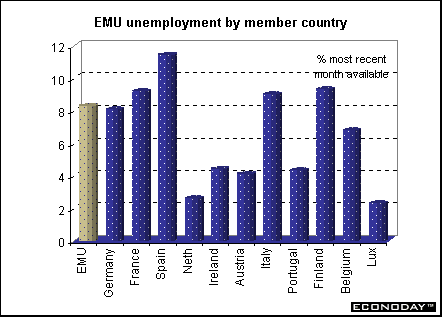 Indicator scoreboardEMU — May seasonally adjusted unemployment rate remained at 8.3 percent. In May 2001 the rate was 8.0 percent. Spain continued to show the highest unemployment rate and Luxembourg, the lowest. It was estimated that 11.6 million men and women were unemployed in the eurozone in line with International Labor Organization criteria.  June seasonally adjusted Reuters purchasing managers manufacturing index rose to 51.8, up slightly from 51.5 in the previous month. The reading was the highest recorded since February 2001. An index level above 50 signals expansion and below 50, contraction. The higher the index is above 50, the faster the expansion. The data confirm the upturn in overall industry during the second quarter but also confirm its restrained pace.  June Reuters purchasing managers services index expanded to 52.9 from 52.1 in the prior month. This was the sixth straight month that the index rose, boosted by further gains in new business and a recovery in Germany. Coupled with a rise in the manufacturing PMI index in June, the composite index for services and industry rose to 53.1 from 52.6. May industrial producer prices excluding construction were unchanged but were down 0.9 percent when compared with last year. Monthly increases were recorded in the intermediate goods sector and the capital goods sector, while both durable and non-durable consumer goods remaining unchanged. On the year, price increases were noted for durable consumer goods, capital goods and non-durable consumer goods. Declines were noted for energy goods and for intermediate goods on the year.  April inflation and workday seasonally adjusted retail sales fell 0.6 percent but rose 0.1 percent when compared with last year. Monthly sales declines occurred for food, drink and tobacco in specialized stores, other sales of non-food products in non-specialized stores, books and newspapers, textiles, clothing and footwear and household goods. Increases were noted in mail orders as well as pharmaceutical and medical goods.
