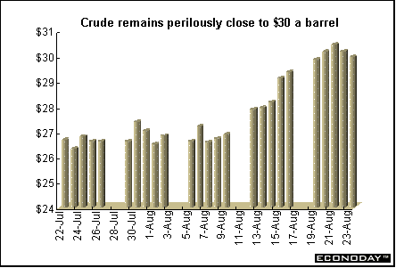 As the volume of rhetoric rises about possible U.S. military action against Iraq, so seemingly does the price of oil. West Texas crude (see graph below) rose above $30 per barrel last week. Building anticipation of possible OPEC quotas at a Sept 18 meeting also contributed to the price pressures. There is some dissention within OPEC whether quotas should be raised in the fourth quarter, a time when world demand normally reaches an annual peak. The 10 OPEC members with quotas (all except Iraq) boosted July production by 130,000 barrels a day, or 0.6 percent, to 23.3 million barrels a day. The total exceeded their overall quota by 1.6 million barrels a day.