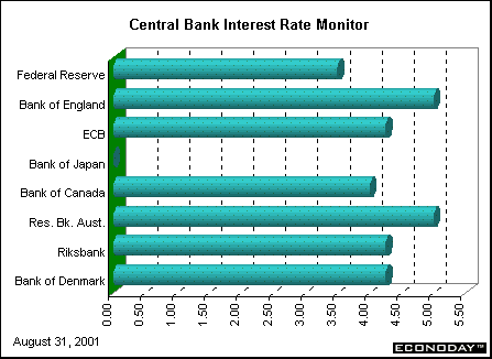 The Bank of Canada reduced its key monetary policy interest rate, the target for the overnight funds, by 0.25 percent to 4.0 percent citing slower economic growth than expected. The Bank has reduced interest rates five times this year by a total of 175 basis points. The overnight rate is comparable to the U.S. federal funds rate and the two week repurchase rate in Britain. The overnight rate target is the mid-point of a 50 basis point operating band. The Bank said that Canadian economic growth has been slower than expected. This reflects reduced foreign demand for Canadian manufactured goods and primary products. That, in turn, is due primarily to the ongoing weakness in the U.S. economy, particularly in capital spending. The magnitude of the slowdown was evident in the second quarter GDP numbers released later in the week. (See indicator scoreboard below.)