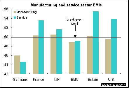 Monthly surveys of purchasing managers in manufacturing and services, available around the first of the month, are keenly watched measures of growth in the U.S. and Europe. In Europe, the surveys for September indicated that both EMU services and manufacturing contracted together for the first time in nearly a year, raising the risk of a slump in Europe. The manufacturing index signaled a contraction for the first time in seven months, disappointment magnified by deterioration in the dominant services sector. The contraction in eurozone manufacturing reflected not only a sharp drop in Germany, but also a marked slowdown in sector growth in other countries as well. In contrast, the services sectors in both the United States and Britain showed continued strength. In Britain, manufacturing is also finally showing signs of revival, though U.S. manufacturing slid under the growth/no growth 50 level for the first time in months. Services account for two-thirds of Britain's economy and have kept the economy growing as the manufacturing sector struggles.
