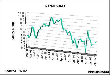 The EconomyConsumers in the lead Retail sales jumped 1.2 percent in April after posting smaller gains in the three previous months. The monthly volatility has been generally associated with motor vehicle sales, which rose in April after declining sharply in January and March. Auto and truck sales excluded, retail sales recorded solid gains in January (1.1 percent) and April (1.0 percent) and moderate gains in February (0.5 percent) and March (0.3 percent). In three of the past four months, gasoline prices have risen sharply in turn affecting sales at gas stations. Consequently, one should look at retail sales excluding autos and gas stations. Sales were healthy, although a bit slower. Nevertheless, there is no question that the consumer sector is leading the economy out of its slump.