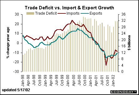 Perhaps one reason that industrial production is posting such slow growth is that manufacturers are going overseas for products. Imports jumped 3.7 percent in both January and February, though they only edged up 0.3 percent in March. Imports of consumer goods have grown faster than imports of capital goods in the past few months, but both are up as the U.S. economy recovers from the 2001 recession. On a year-over-year basis, exports have also gained but not as much as imports since the U.S. economy is growing faster than its primary trading partners.