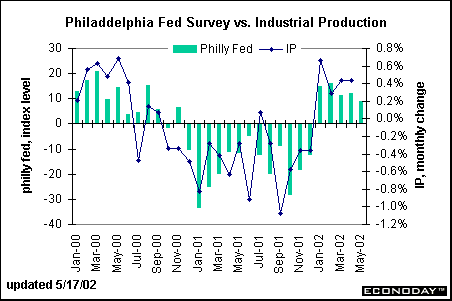 The pace of industrial production may not accelerate soon. A reflection of the week's economic mixed bag, the Philadelphia Fed’s business outlook survey, which is a leading indicator of industrial production, edged down in May to a level of 9.1 from 12.3 in April. While any level above 0 signifies an expanding manufacturing sector, it does appear that the levels from March through May have slowed relative to the first two months of the year. As evident from the chart below, the index of industrial production tends to move closely in line with the business outlook survey. Thus, on its own, the Philadelphia Fed data would suggest that industrial production growth should be modest in May and not accelerate from the 0.4 percent gains of the past two months.