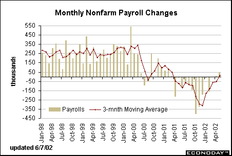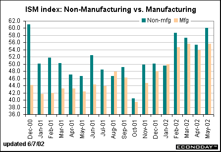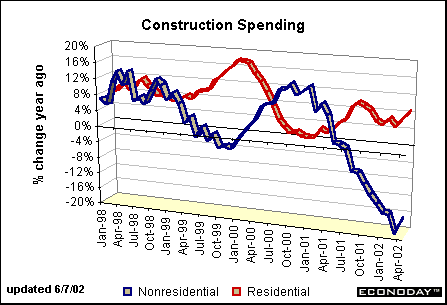 The ISM non-manufacturing index is not a composite index like its manufacturing cousin. Rather the index that garners all the attention here is the production component. Notice that production in the service sector reached 60.1 in May, its highest level since December 2000. This confirms that the economic recovery has been in place since February, which bodes well for coming months. Construction spending on the mend?Residential construction rose 0.7 percent while nonresidential construction spending increased 1.5 percent in April. Residential construction spending stood 8.5 percent above year ago levels in April, an improvement over the previous few months. It also appears that nonresidential construction spending may have hit bottom in March as the year-over-year decline was smaller than in April. As one can see from the chart below, it isn’t unusual for residential and nonresidential construction spending to move in opposite directions over the business cycle. In fact, the period when they both moved in tandem in 1998 is more atypical. Thus, if nonresidential construction spending starts heating up, don’t be surprised if residential spending slows. Indeed, even though most economists have given up on their forecasts that housing starts would decline in 2002, most are still looking for housing construction to remain stable with a year-over-year change close to zero.