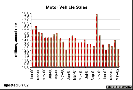Since the employment report usually sets the tone for the month, it is likely that the negative sentiment we have seen in the past month will persist. It would take very friendly retail sales and industrial production figures to change it. However, chain-store sales reported this week and Friday’s employment report indicate that these mid-month indicators will very likely be soggy. Motor vehicle sales plungeDomestic cars were sold at a 5.7 million-unit rate in May while light trucks were sold at a 6.9 million-unit rate. In both cases, sales were lower than predicted by economists but investors shouldn’t have been surprised. Remember that motor vehicle sales zoomed to unprecedented heights in October when automakers offered various incentives including zero percent financing on cars and trucks. At the time, many economists suggested that this would borrow from future sales. When motor vehicle sales held on at a pretty decent rate, analysts started believing that a new market had been tapped. In fact, an end of the incentives brought sales down to more earthly levels. The May selling pace of 12.7 million units (at a seasonally adjusted annual rate) appears weak by comparison of the past few months, but put in the context of historical selling seasons, it isn’t all that bad. But automakers were nevertheless disheartened with the sales pace and ended up putting new incentives in place early this month.