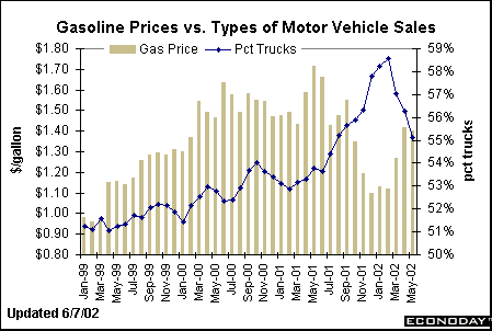 When gasoline prices started to rise rapidly from 1999 to 2001, many analysts became concerned that it would hurt light truck sales. The chart below reveals that truck sales, as a percent of total motor vehicle sales, have climbed right through periods of high gas prices. Yet truck sales are now feeling the pinch, declining as gasoline prices have started to rise.