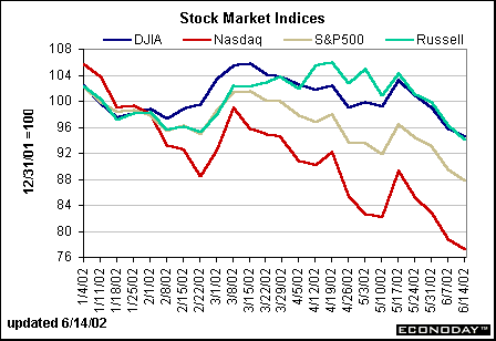 Recap of US MarketsMarket tumblesWhile the economic figures aren’t terrible, they are confirmation that the economic recovery will be slow. Economists and Fed Chairman Alan Greenspan aren’t surprised, but equity investors had unreasonable expectations about the economic recovery. Now they are disappointed. In addition to the problems with the economy, investors are also unsure how to deal with the repeated warnings of new terrorism on U.S. soil. To top it off, terrorist attacks in the Middle East are continuous. If there weren’t enough problems to deal with, corporate scandals are mounting and causing investors to doubt the veracity of financial statements. All this adds up to a very depressed market environment.